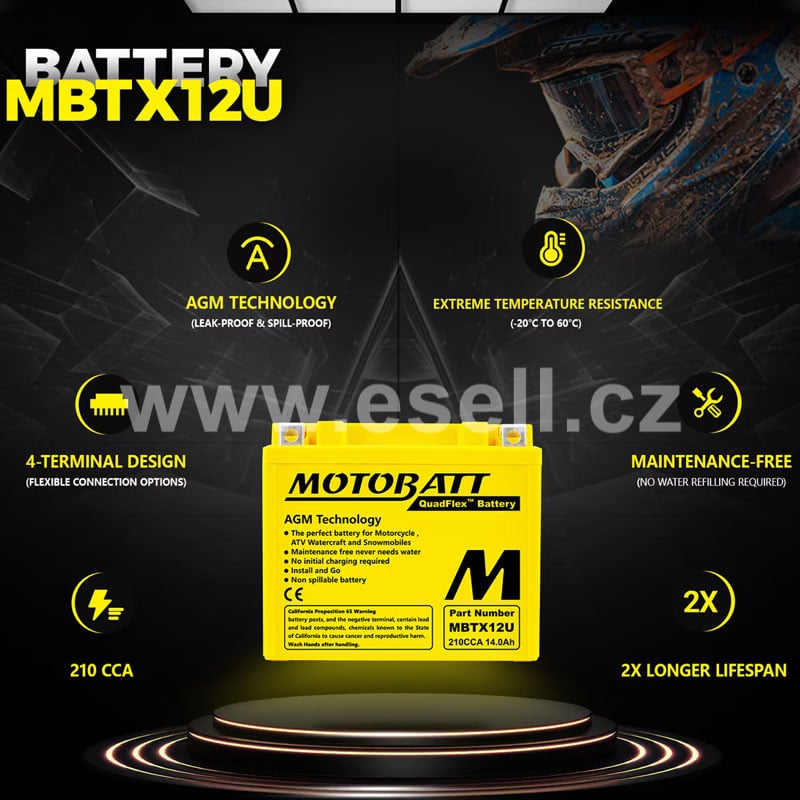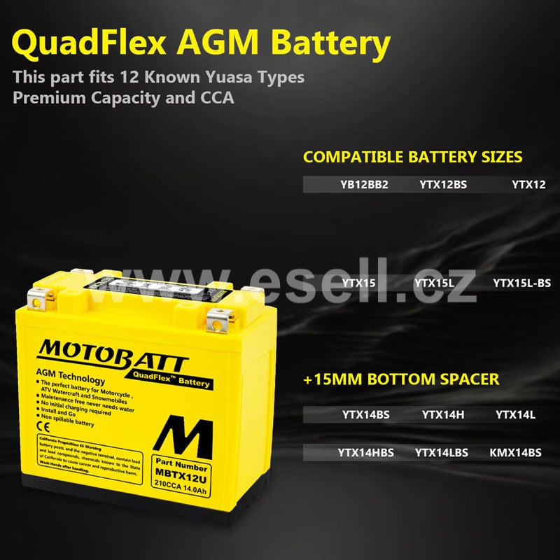 Baterie MOTOBATT jsou prémiové motobaterie s velkou výdrží vyrobené v USA. Vysoce odolná díky separátoru ze skelného rouna. Doménou značky MOTOBATT je konstrukční technologie QuadFlex, která poskytuje velkou variabilitu při montáži.