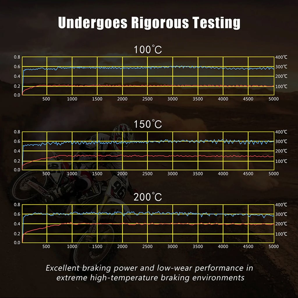- Koeficient tření při nízkých teplotách: 0,49µ–0,53µ (212°F) - Koeficient tření při vysokých teplotách: 0,52µ–0,55µ (392°F–572°F) - Slinutá měď: Obsahuje více než 50 % měděného prášku, bez obsahu keramiky nebo uhlíkových vláken - Odolnost proti vysokým teplotám: 1112°F–1472°F - Odolnost proti nízkým teplotám: Ne nižší než 14°F - Počáteční brzdná síla: 692N (212°F) - Brzdná síla při vysokých teplotách: 736N (392°F–572°F) - Opotřebení kotouče: Nízká agresivita - Hluk tření: Tichý - Voděodolnost: Voděodolný