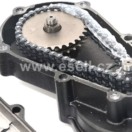 pro řetěz T8F (viz. nákres v detailu) větší životnost než klasická převodovka, dojitý řetěz (uvnitř převodovky), převodový poměr je cca 3,15