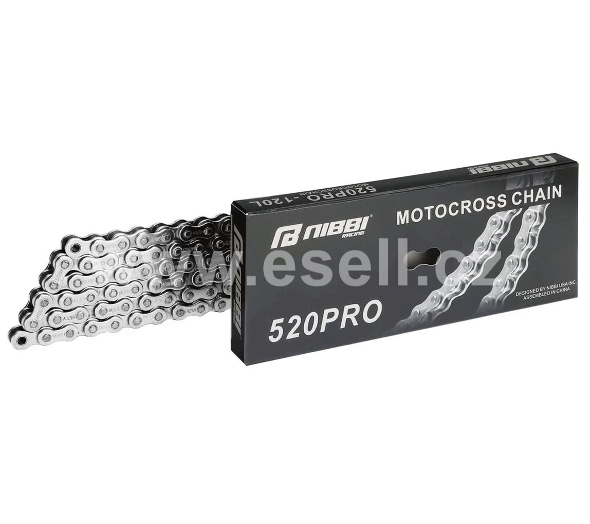 Řetěz 520 NIBBI racing PRO 120 článků premiový řetěz s vysokou pevností - pevnost v tahu 3,6 tuny - bezpečnější použití - dlouhá životnost - nízké tření - delší životnost - pevný řetěz, neláme se - řetězová destička je zesílena a tvrzena tepelným...