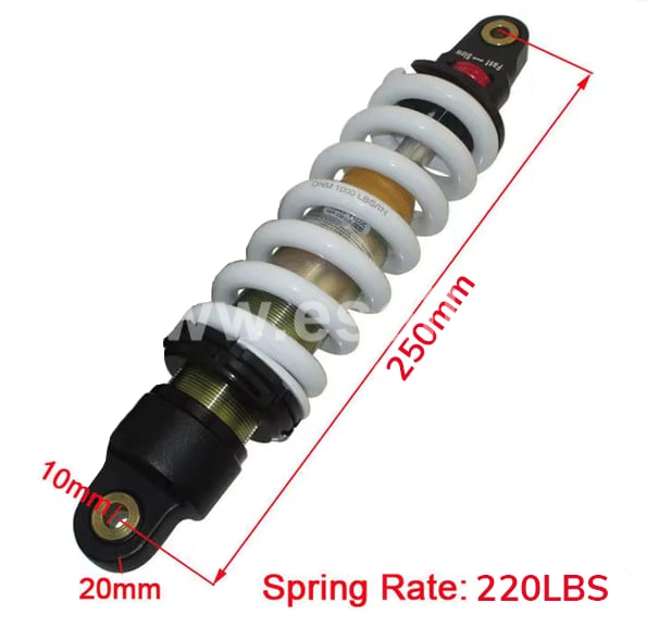 - Pružina 220 LBS je vhodná pro jezdce s váhou do 30kg (max. 45kg včetně veškeré výbavy) - Ttuhost (přibližně 3.9 kg/mm). Tento tlumič je jedním z nejměkčích dostupných tlumičů pro pitbiky a je určen primárně pro velmi lehké jezdce nebo děti.