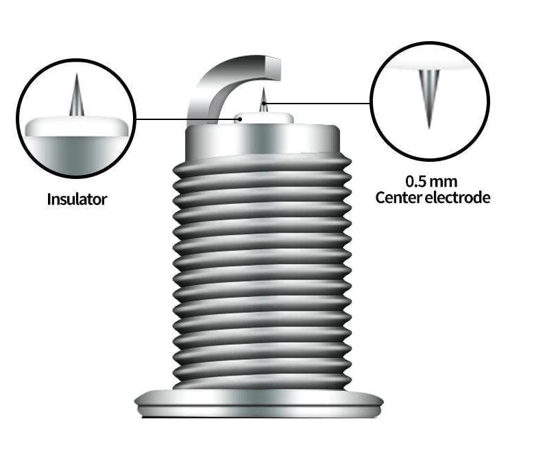 - Středová elektroda s ultra malým průměrem snižuje požadavky na napětí a prodlužuje životnost zapalovacího systému.